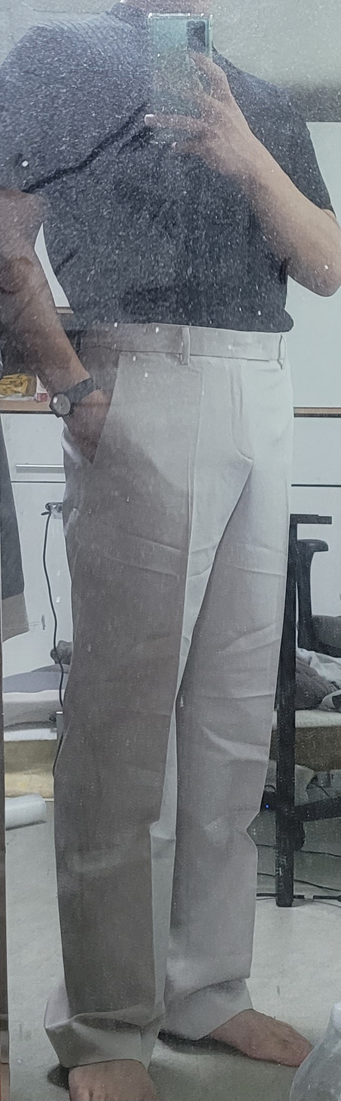 코디는 마음에 듭니다. 보내주신 바지를 꺼냈는데 수정이라는 표시와 바지 얼룩이 있습니다. 얼룩이야 그냥 넘어가고, 사진만보고 체형에 맞는 옷을 고른다는게 쉽지않겠죠.. 착샷을 찍지 못했지만 바지의 front rise 부분이 너무 길었습니다.